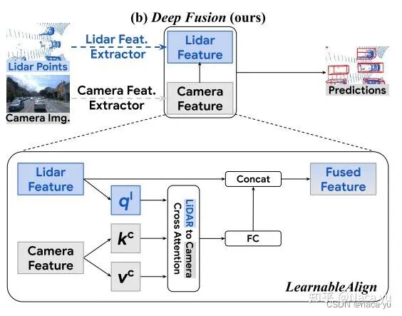 这里主要提出:一:inverse aug与learnable align,分别解决数据增强后模态融合的对齐问题以及实现模态之间的自适应对齐,这里融合的方式为将lidar作为主要的数据来源作为queries融合作为kv的图像特征,并将与query对应的图像特征提取后与雷达特征进行concat并融合用于特征检测。