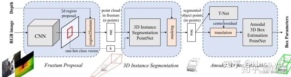 在 RGB 图像上运行的 2D detector,产生的2D bbox用于界定3D视锥包含前景目标点云。然后基于这些视锥区域中的 3D 点云(centerfusion的灵感来源于此),使用PointNet++ 网络实现 3D实例分割并随后实现3D 边界框估计。