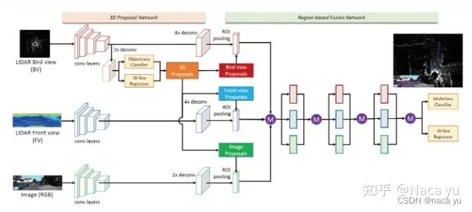 作者认为,雷达点云主要存在以下问题:1)稀疏性(2)无序性(3)冗余性,这里通过在BEV视角中初次进行region proposal后投影到激光雷达FV与图像FV层进行目标的ROI Pooling,再通过deep fusion融合特征,最后进行3D回归和分类。