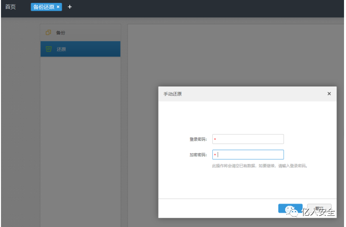 怀着*了狗的心情,又去看了下这里的还原功能,发现就是备份的逆逻辑,在你上传一个压缩包之前同样需要输入加密密码;于是猜测这里的加密密码后端是做了一些处理的,单纯的使用加密密码无法解压备份文件