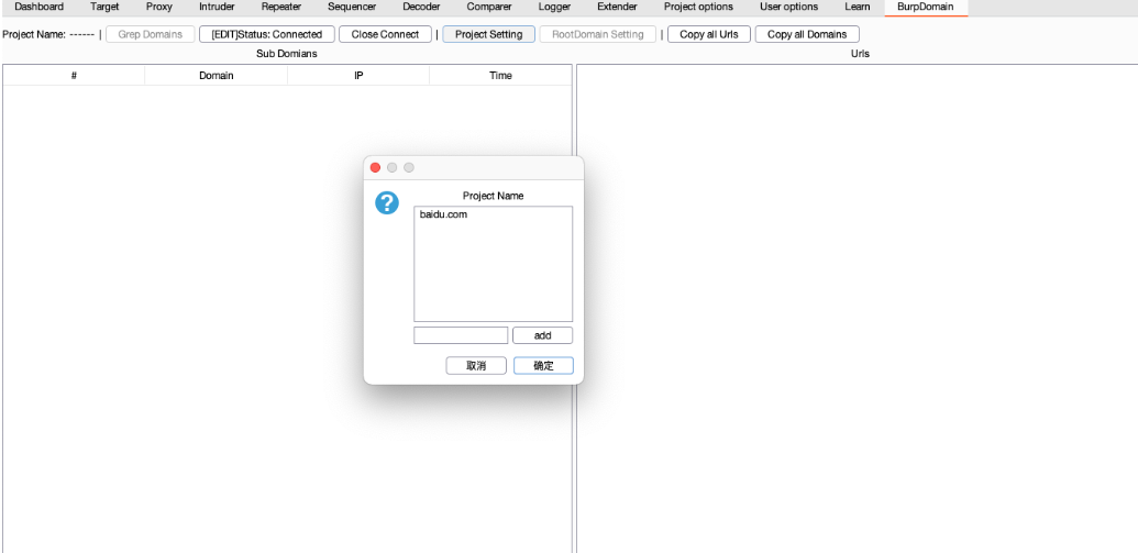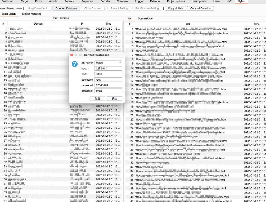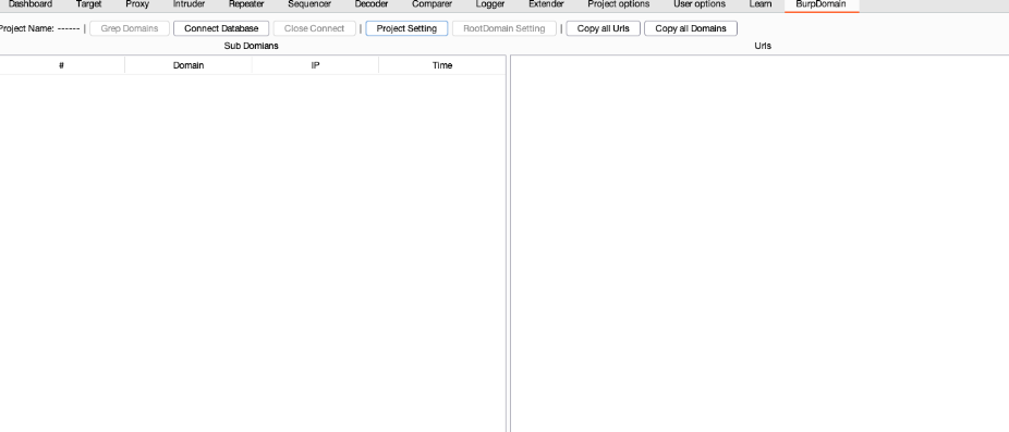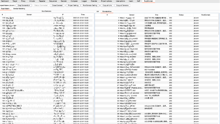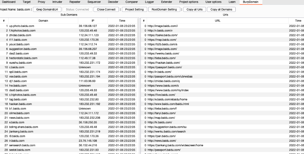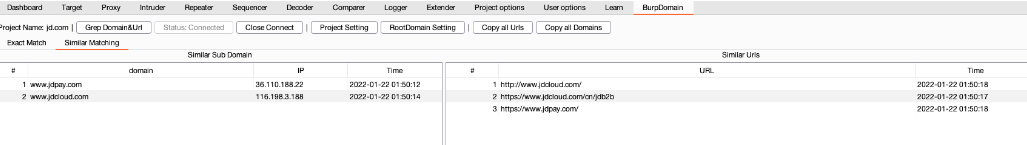 当使用burp代理时,会从经过burp的流量中抓取域名进行储存。不需要开启,插件启动以及数据库连接之后就会自动拉取。