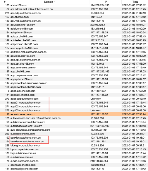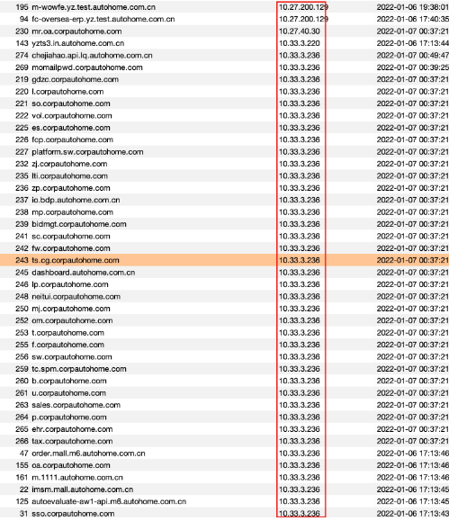 根据字段排序功能可以快速筛选出内网IP、相似网段IP以及相似域名,可以根据这些信息自定义域名字典、爆破HOST等,进一步扩大信息收集范围
