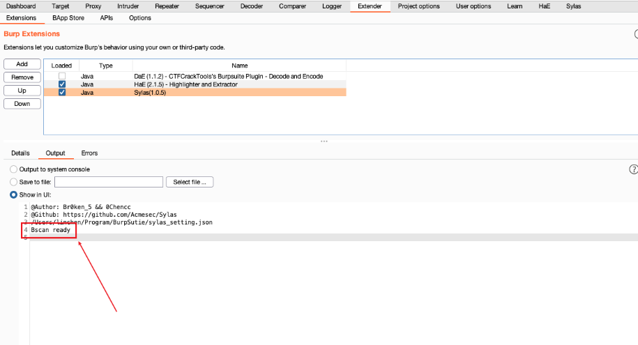 在配置完毕Bscan之后,需要重新连接一次Mysql数据库。查看Burp-Extender有无打印出Bscan Ready字符串,如果打印则该功能已启用。