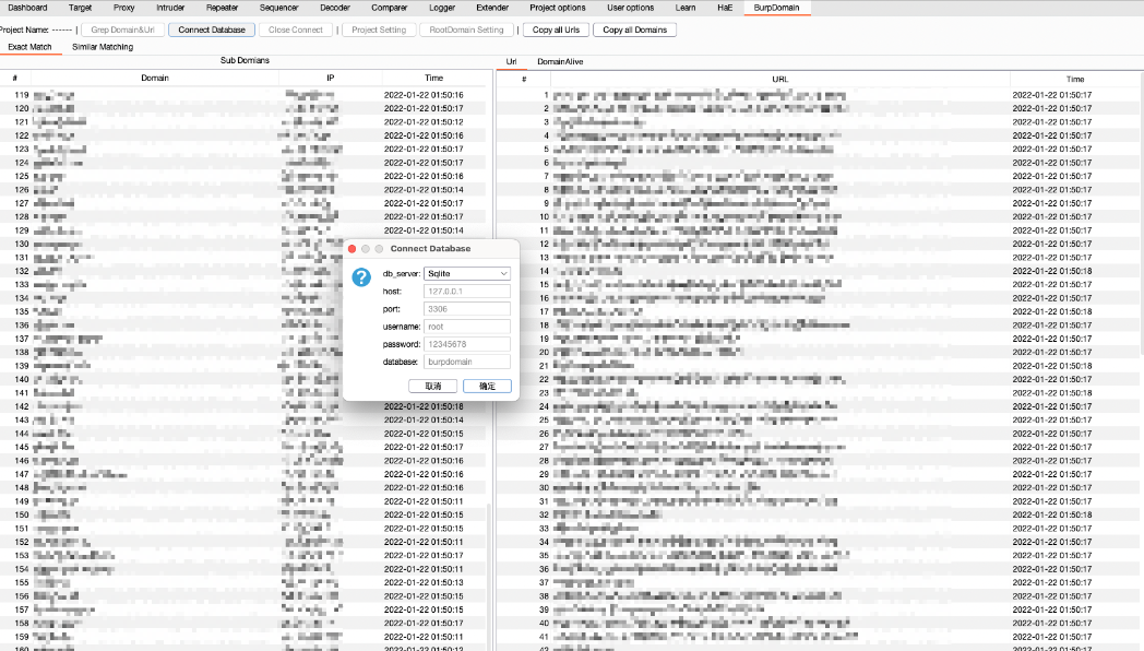在当前版本以及往后所有版本里,都支持了Sqlite,如果只是想单纯使用BurpDomain的功能,那么只需要Sqlite即可。