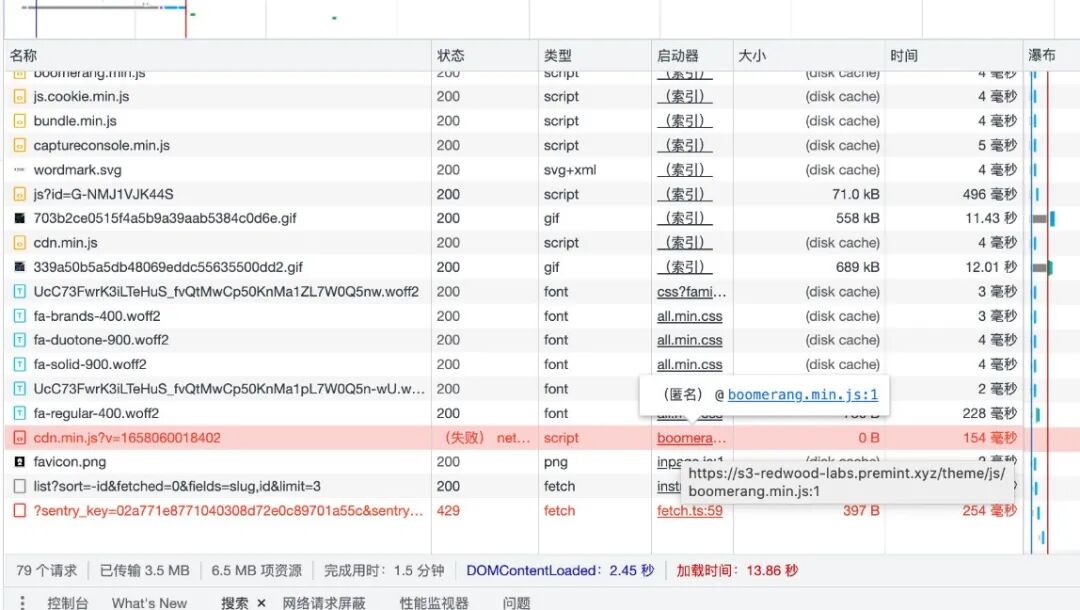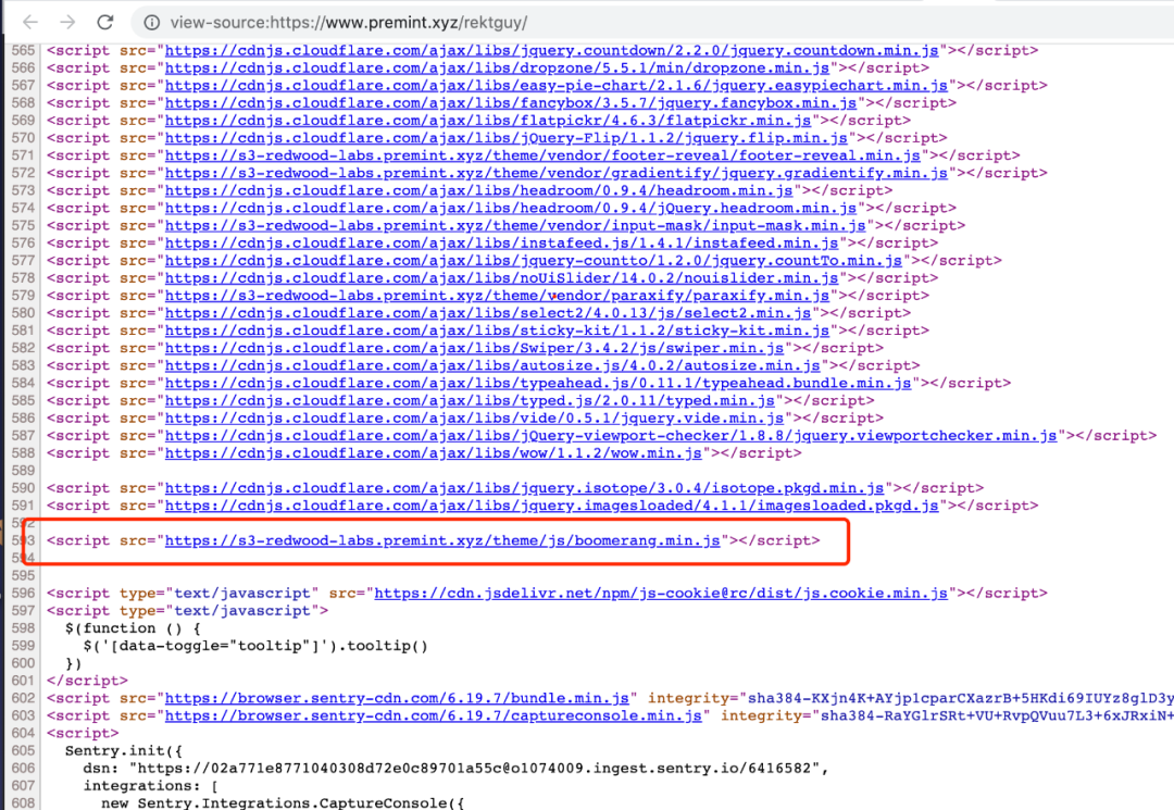打开任意 Premint 项目页面,可以看到有个 cdn.min.js 注入到了页面中,看调用栈该 js 是由 [boomerang.min.js](https://s3-redwood-labs.premint.xyz/theme/js/boomerang.min.js) 注入,目前该 s3-redwood-labs-premint-xyz.com 域名已经停止解析,无法正常访问了。