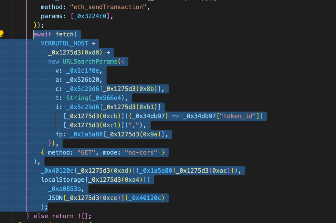 根据代码内容,可以大致看到有通过调用 dappradar.com 的接口来查询用户的 NFT 资产列表(此前我们也有看到恶意网站通过 Debank,Opensea 的 API 来查询用户资产等)。