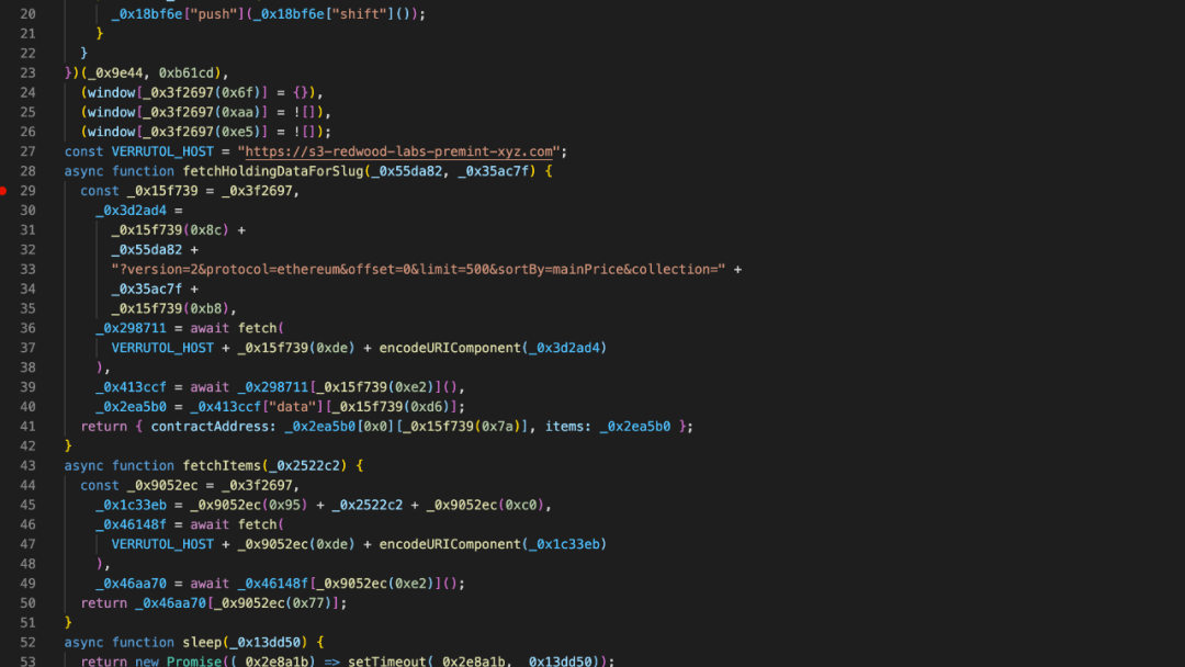 这段代码负责把代码 s3-redwood-labs-premint-xyz.com/cdn.min.js 注入到页面。