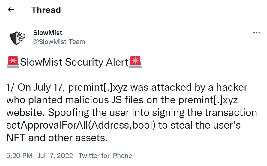 7 月 17 日,据慢雾区情报反馈,Premint 遭遇黑客攻击。慢雾安全团队在第一时间进行分析和预警。