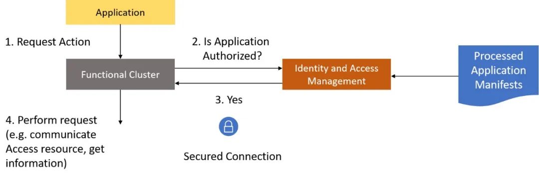 IAM稍微去理解一下它的过程,首先是应用程序去请求一些动作。它是通过一些中间件Functional Clusters去操作,操作它之前我们去先通过IAM这个模块去认证它是否是被认证过的一个应用。在IAM返回一个认定结果以后,它才可以真正的使用到一些请求的一些资源,它就是IAM标准的实现的一个过程。下图细节地描述了怎么做它的一个隔离?首先它应用和下面的一些资源是在没有IAM做一些Check之前它是隔离的。需要通过一系列的判断的以后,给出一些认证结果,它才能正常的使用资源。