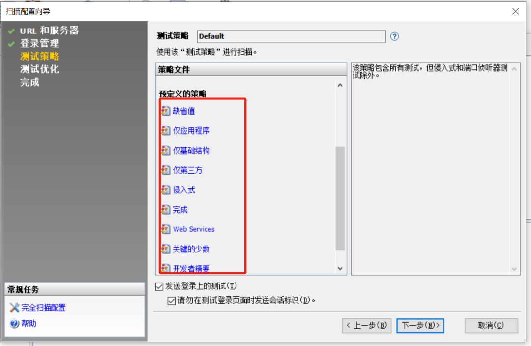 ①缺省值:包含多有测试,但不包含侵入式和端口侦听器