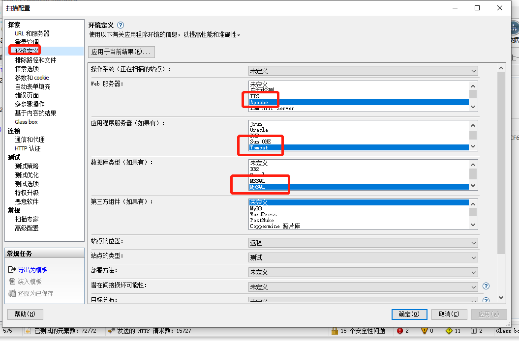 12.在扫描菜单栏中选择扫描配置,弹出扫描配置对话框,在环境定义中选择测试系统需要的配置,点击应用(可选)
