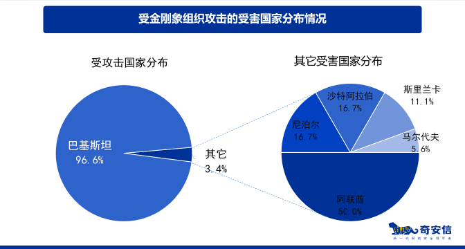 金刚象组织主要针对巴基斯坦、阿联酋、尼泊尔、沙特阿拉伯、斯里兰卡、马尔代夫等印度周边国家发起攻击,对政府机构、国防军事部门人员实施网络间谍活动,攻击活动具有强烈的军事意图。其中巴基斯坦是最主要的受害国家,目前已受害人员近600名,受害占比96.6%。