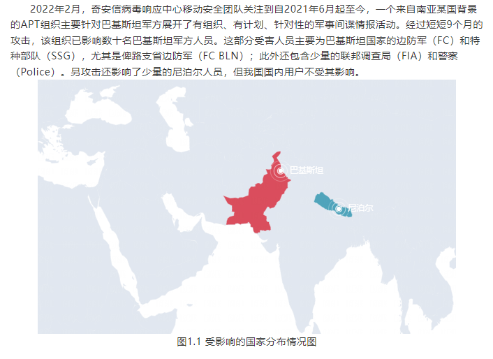 2022年3月,奇安信病毒响应中心将该APT组织命名为金刚象组织(VajraEleph)并进行全球首次公开披露。报告中提到了该组织针对巴基斯坦和尼泊尔国家进行了攻击,主要涉及了巴基斯坦多种部队的军事人员。