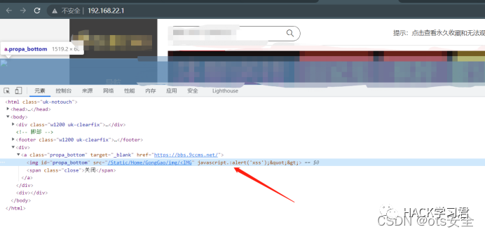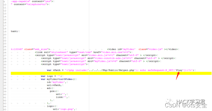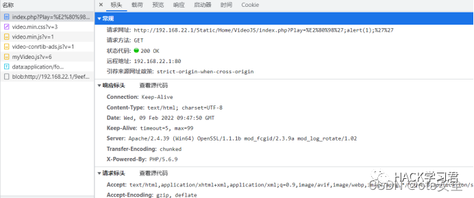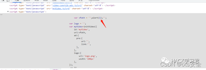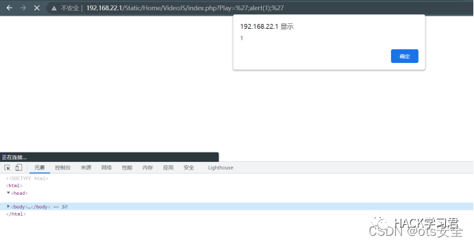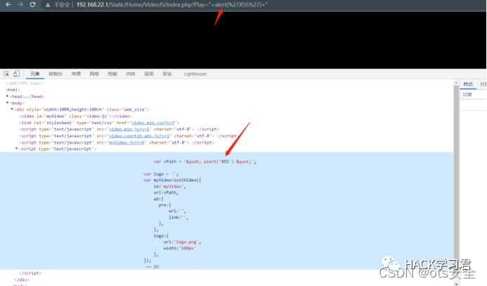 http://192.168.22.1/Static/Home/VideoJS/index.php?Play=发现没有弹窗,那么审查元素,在底部 xss语句使用了: