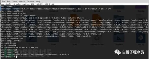 执行[email protected]:~# echo envi|nc 192.168.131.128 2181 获取服务器环境信息: