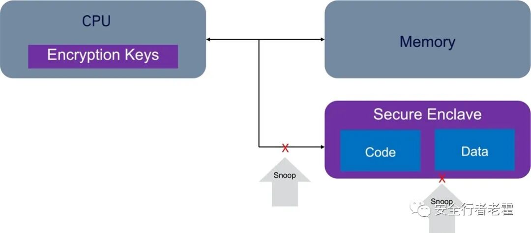 英特尔软件保护扩展(SGX)是一个广为人知的机密计算的例子。它允许应用程序定义主内存的一个私有区域,称为安全飞地(secure enclave),它的内容不能由enclave之外的任何进程读取或写入,无论其特权级别或中央处理单元(CPU)模式如何。即使在操作系统、管理程序和容器引擎受到威胁时,这种隔离也可以保护enclave。此外,enclave内存使用存储在CPU内部的密钥进行加密。只有飞地内的代码,才能在CPU内部解密。这意味着,即使有恶意的实体从物理上窃取飞地的内存,对他们来说也没有任何用处。