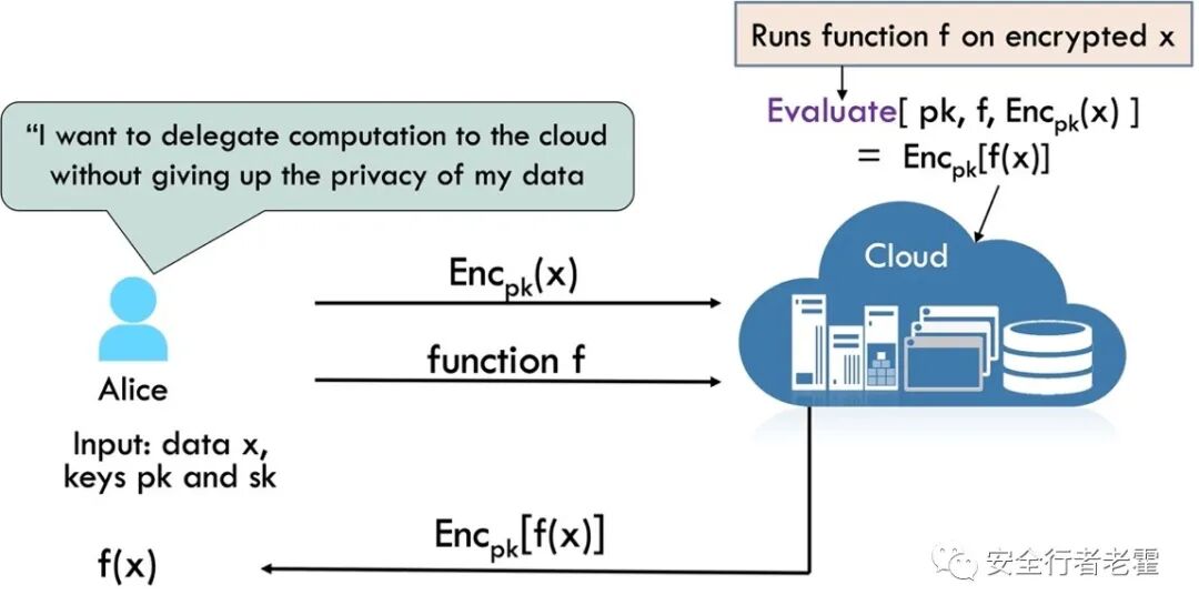 全同态加密(FHE)是一种非对称加密,因此使用了如图所示的公钥(pk)和私钥(sk)。Alice使用私钥加密她的数据,并将她的公钥共享给云服务,在云服务中,函数f作用于加密数据。当Alice收到结果后,用自己的密钥解密,得到f(x)。