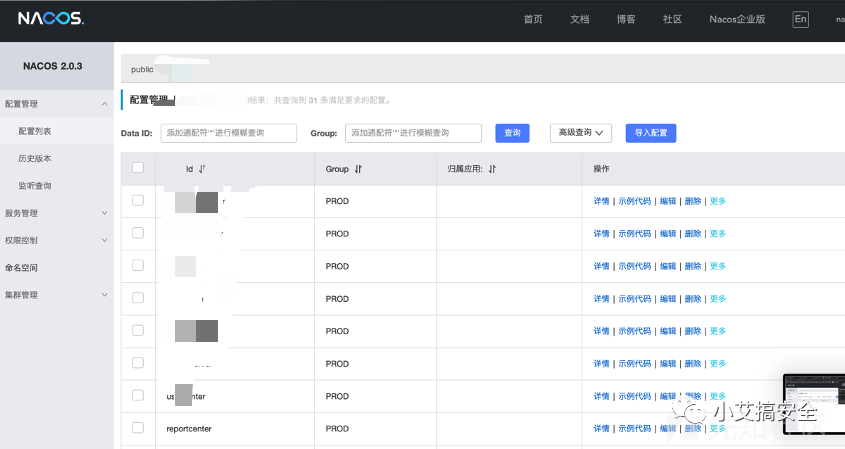 接着来看web服务,发现有很多nacos的服务,都有身份绕过的洞,进去又找到一堆数据库和AK的配置,接着补充到漏扫进行爆破。