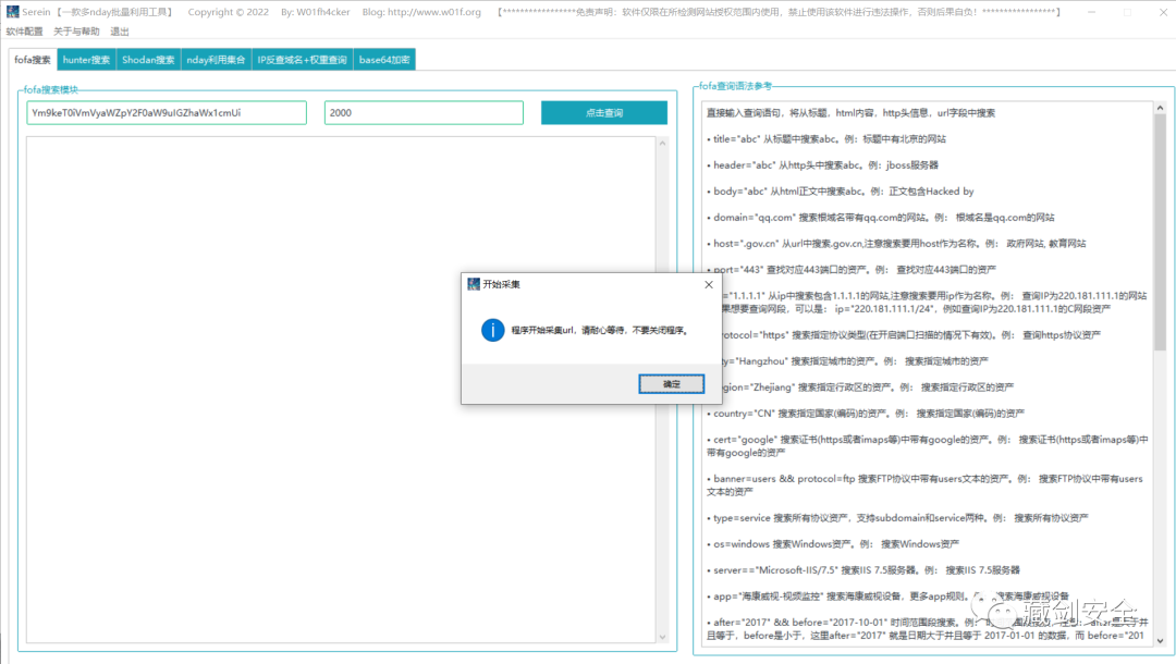 点击左上角的软件配置配置fofa的email和key(注意不是密码,而是https://fofa.info/personalData下方的API KEY),然后就可以愉快地使用fofa搜索啦。