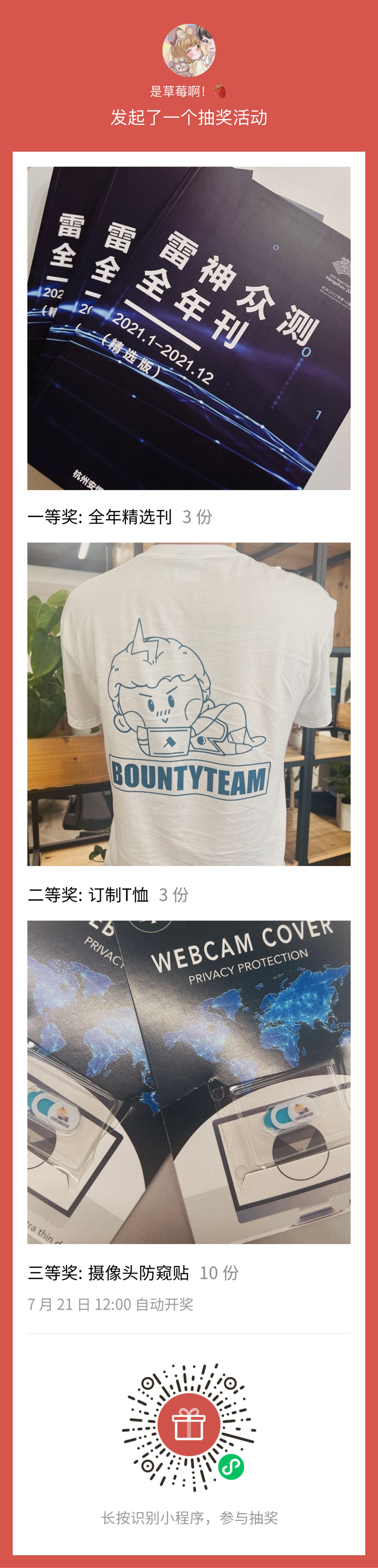 活动内容:推荐新白帽加入雷神众测,新白帽完成一个有效漏洞提交(以奖励发放为准)推荐人和被推荐人均可获得《雷神众测全年精选刊》以及雷神众测礼包一份。