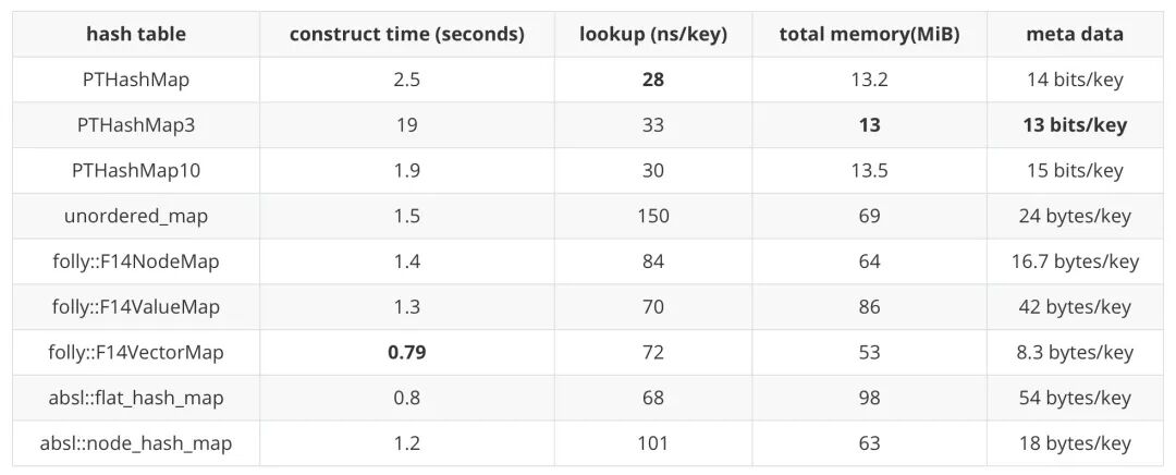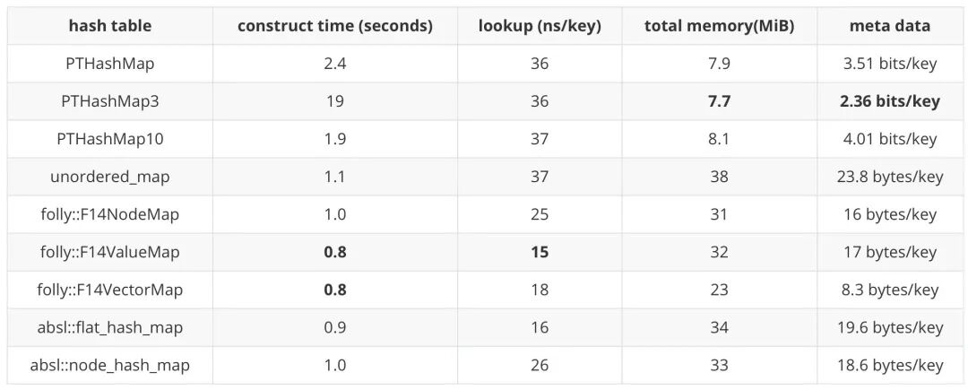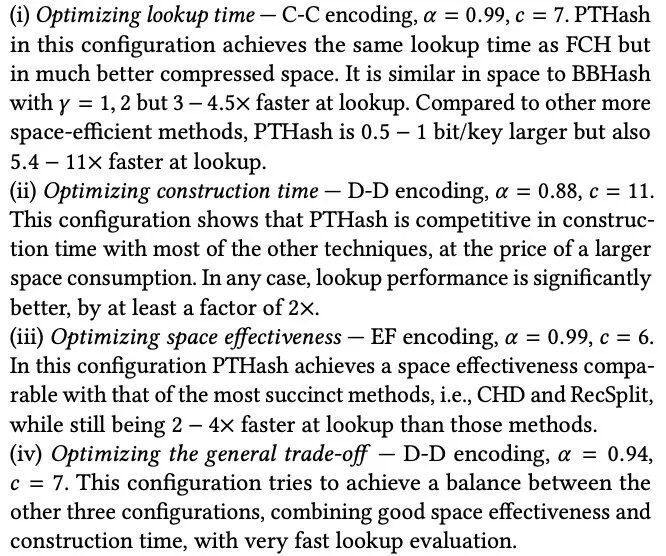 虽然 CHD 实现简单,但其中包含了大量除法求余计算,Encoding 后效率并不高,lookup 耗时过久。最近有一篇文章提出了 PTHash 方法,在 FCH 上改进了构建时间,并提高了空间利用率,作者还提供了源代码供参考。