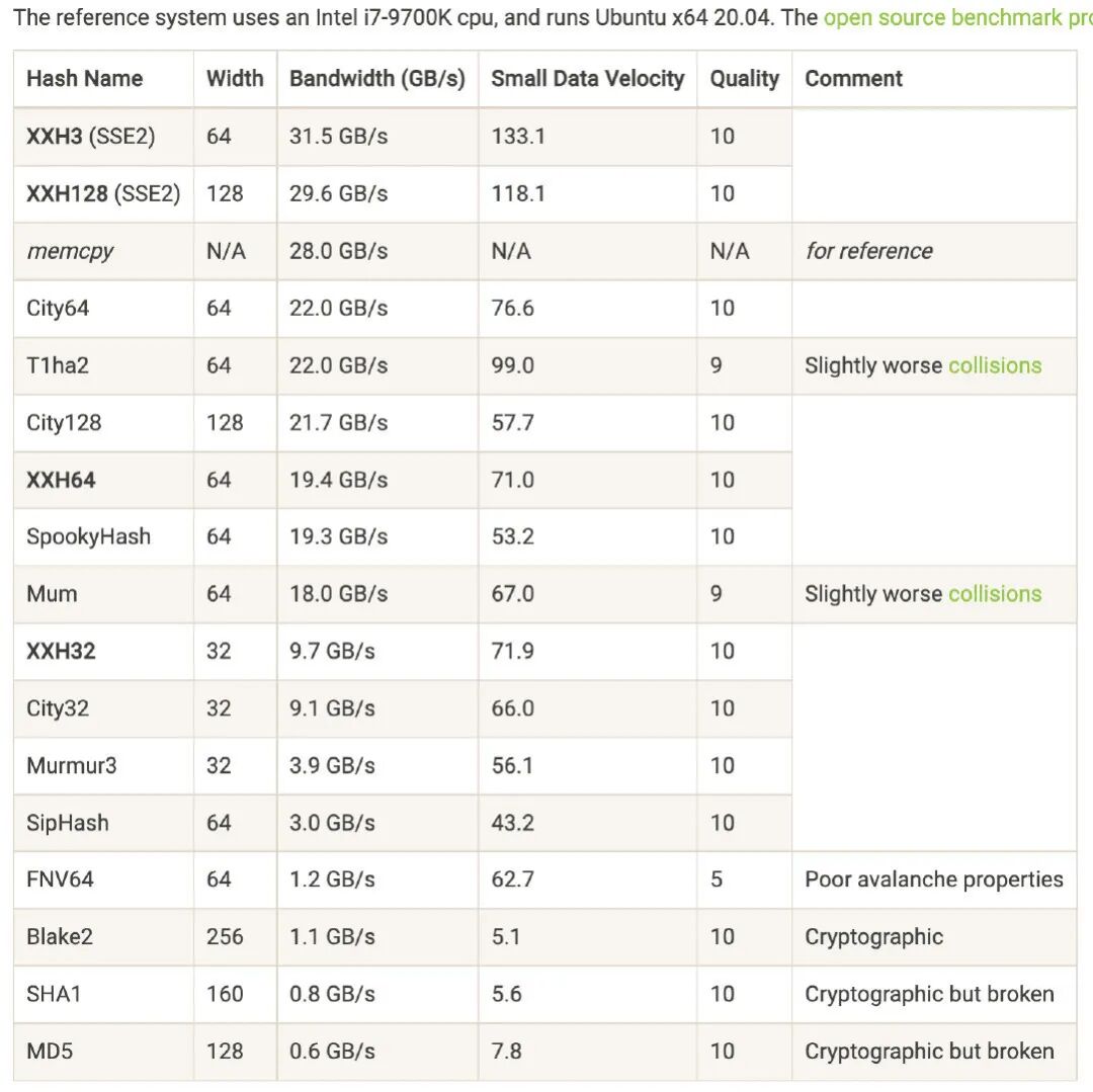 xxHash 的 benchmark,统计了常用 Hash 函数的性能: