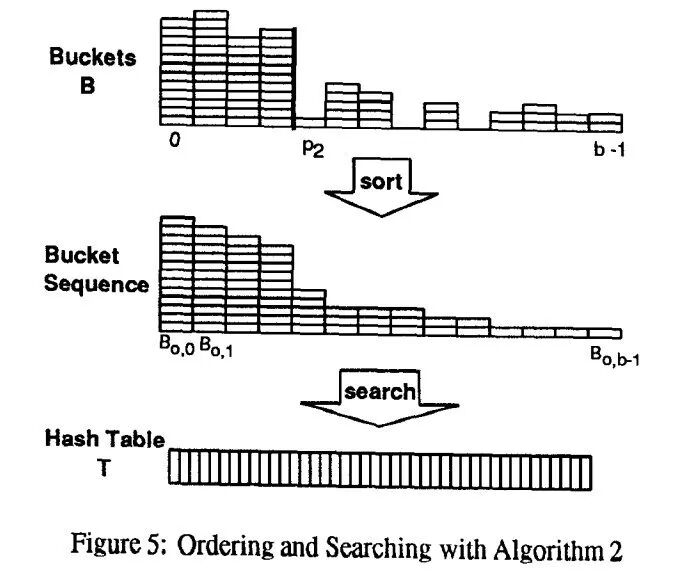 Searching 阶段会依次处理每个桶里的冲突,尝试将不重复的 Hash 值分配给每一个 key。经过了上一个阶段排序,该阶段会优先处理冲突最多的桶。对于每一个桶,尝试参数 di, bi,给桶内每一个 key 分配 Hash 值 position(x, di, bi) = (h(x, s2 + b1) + di) mod table_size,这个值在 [0, table_size) 之间,其中 s2 是全局随机种子,bi 是单个 bit,di 是一个从 0 开始的递增的整数,如果 Hash 值在桶内和之前计算过的 Hash 值冲突,则改变 bi 或者 di 直到 Hash 值不发生冲突(为了加速 di 的寻找,原始论文中提出了辅助数据结构和压缩方法,感兴趣可以参考论文)。