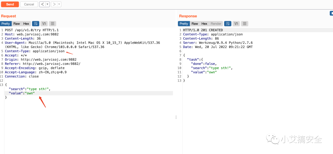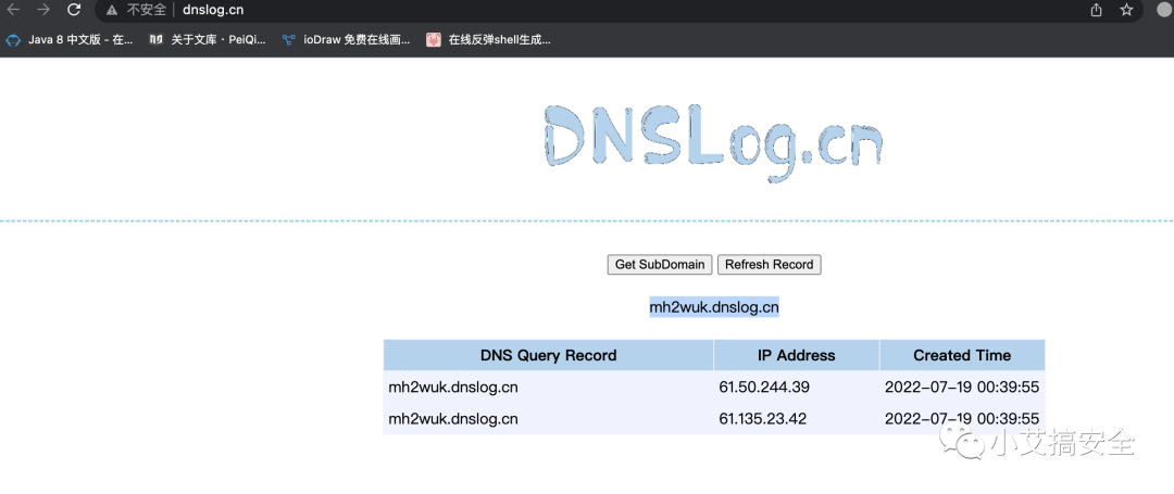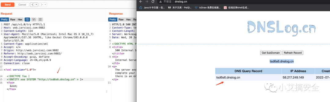 通过上图,我们发现数据是通过json传输,这道题考查的是XXE,我们尝试修改Content-Type类型为Content-Type: application/xml,然后构造XML结构向dnslog发请求,如果dnslog收到请求,那么说明存在XXE漏洞。说干就干,构造数据包,然后查看dnslog,发现成功收到请求,存在XXE漏洞。