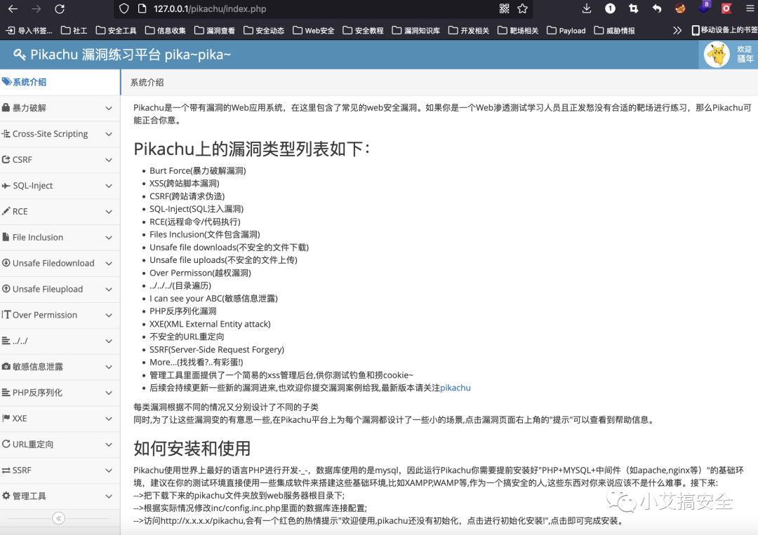 这里用本地搭建靶场的方式进行演示,靶场使用的是pikachu,地址为:https://github.com/zhuifengshaonianhanlu/pikachu,搭建流程这里不在赘述,搭建成功如下图,然后开始演示。