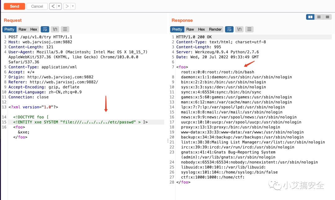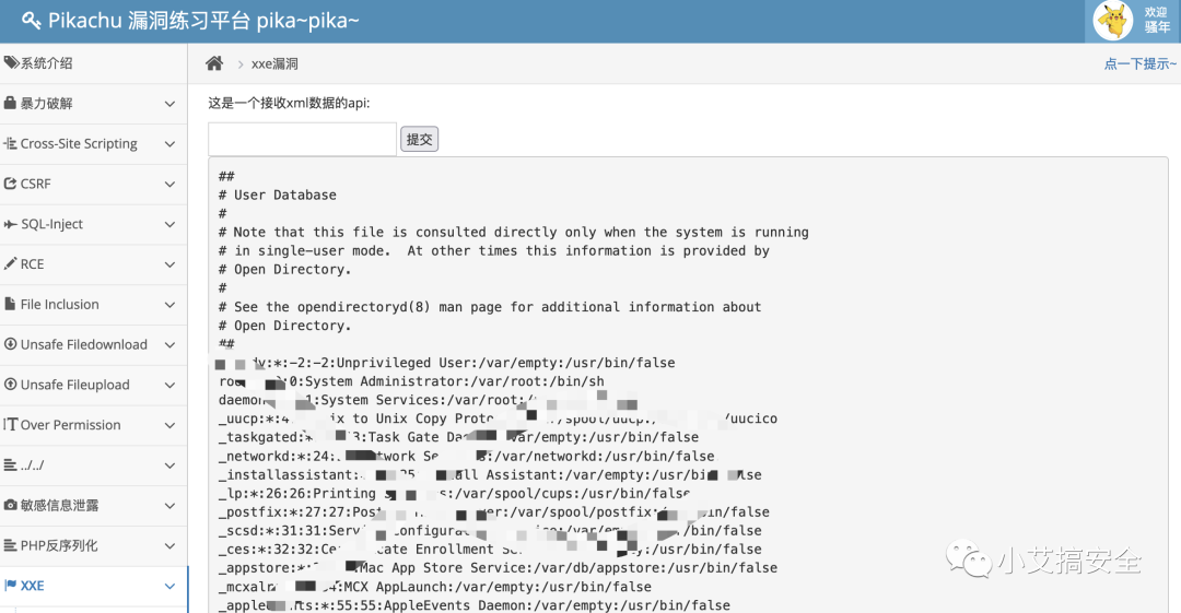 <x>&f;</x>因为是搭建在本地,所以我读取一下本地的passed文件,将[目标文件及路径]改为../../../../../../../etc/passwd,结果如下图