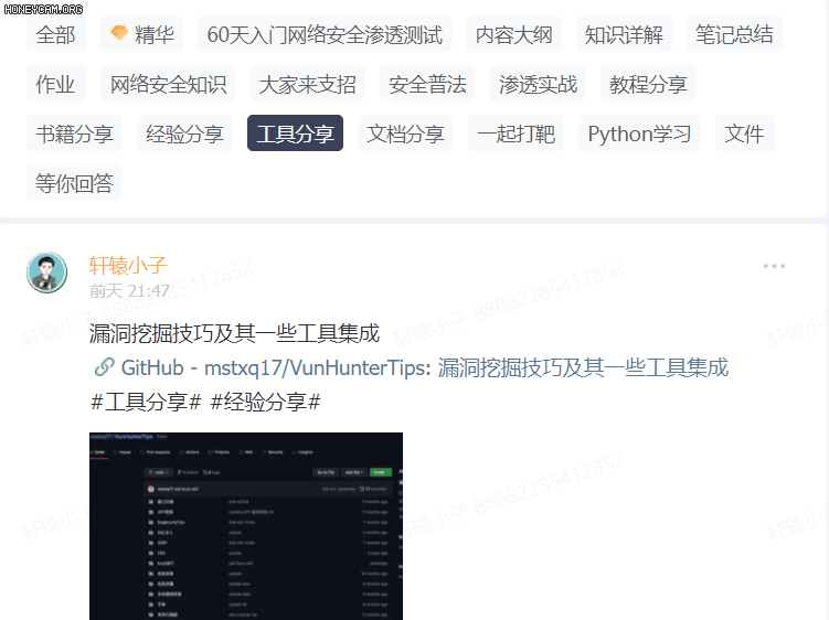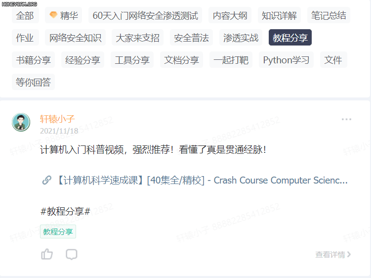 星球内除了提供最基本的关于网络安全学习路线,还设立了各个子模块精华:该模块为设置为精华帖存放的地方,目前有11篇,主要为必读帖60天入门网络安全渗透测试:内容大纲+知识详解集合安全普法:关于网络安全中涉及到的法律问题,切勿未授权测试!