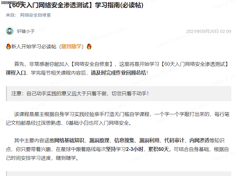 除了技术相关的教程、工具、靶机、干货技巧等资源外,还可以针对性提出自己在具体技术方面的问题,我都会挨个细心回答。 最最重要的是,我将我自己的学习路线结合实践踩坑笔记及各大教程的精华,以自学者的第一视角,整理归纳出《60天入门网络安全渗透测试》学习计划和相关课程。《60天入门网络安全渗透测试》