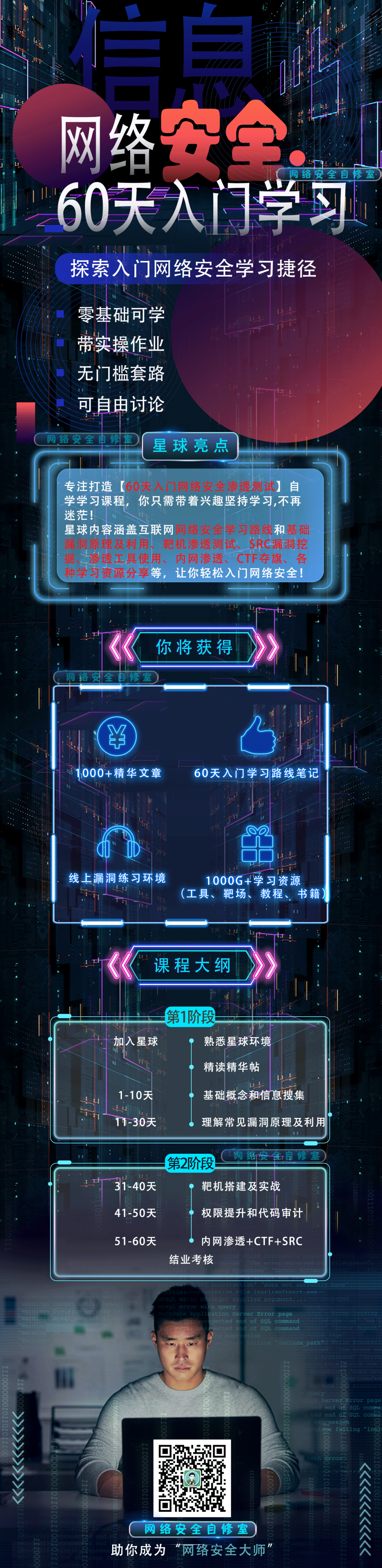 该课程是我根据自身学习实践经验亲手打造0门槛线上学习内容,都是一个字一个字敲打出来的,每行笔记文档都是经过深思熟虑,针对0基础小白也可轻松入门网络安全! 课程内容主要涵盖网络基础知识、漏洞原理、信息搜集、漏洞利用、代码审计、内网渗透、权限提升等知识点,具体60天内容计划可看下图 你只要带着兴趣,累积60天,在星球中跟着路线坚持学习2-3小时,就能学会! 而且如果学习过程中遇到问题,都可以在星球中提出,大家一起讨论提高,同时可相互监督,不断提高! 目前该《60天入门网络安全渗透测试》学习路线目前更新到第22天,进度如下图,每节内容都有对应的学习大纲和知识详解以及相关作业,随到随学,快来和我一起学习吧!![]()