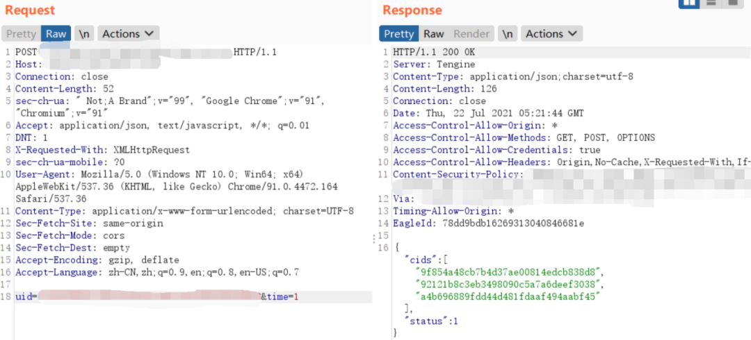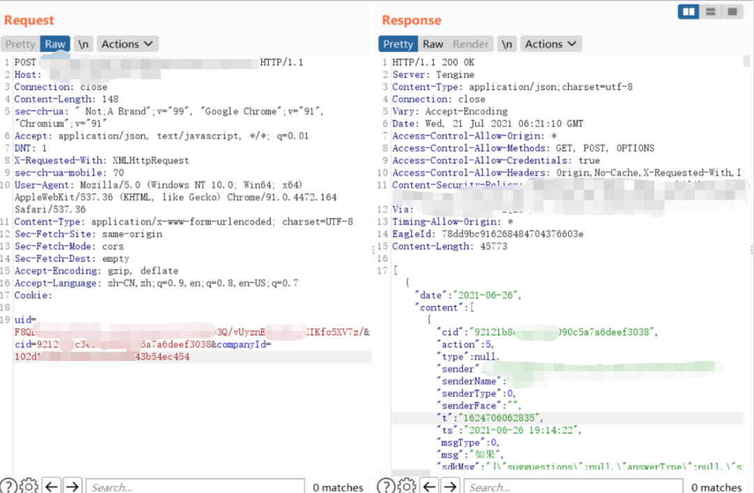 不难想出,可以通过更改uid的方式来查看别人的聊天记录。但我实际测试后发现,在第一个数据包如果更改为别人的uid,是可以返回别人的会话名称的。但到了第二个数据包,发送的uid参数经过了加密,最后结果类似于以下字符串: