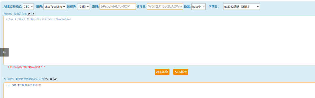 已经很明显了,这是一个CBC方式的AES加密,密码是bPsoyIvIALTcy6OP,偏移量是W8m2J1I3pQUADWy,直接把加密后的密文用工具解出来: