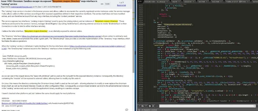 之后通过CVE-2018-6055绕过chrome沙箱,该漏洞由[email protected] 发现,mojo接口filesystem::mojom::Directory存在漏洞,可导致任意文件读写,这个接口存在于mojo server catalog中,也就是上文中通过shellcode修改的的字符。