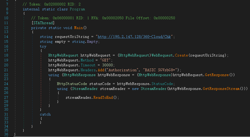 攻击者利用反弹shell执行一些cmd命令创建计划任务和横向移动,接着攻击者先是下发了一个名为360ChkCloud的下载者测试文件,功能非常简单。