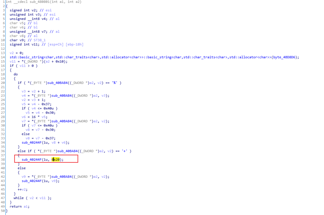 会依次判断该数据是否为%,+,实际上%是用于处理unicode,而会将+转化为空格,也就是说exp中只需将空格替换为+号,后续代码中会自动将空格恢复。