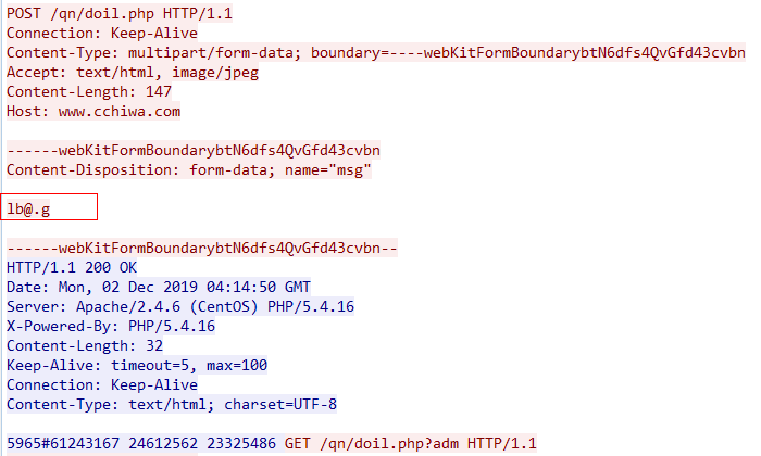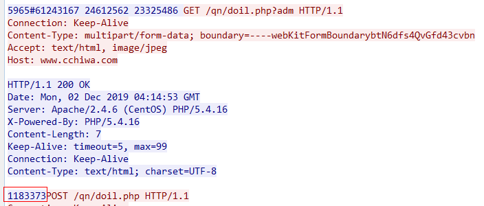 2. 木马发送的第二个数据包为/qn/doil.php?adm,该数据包是GET请求,会返回下一个数据包返回的数据的大小(插件包pkg的大小)。