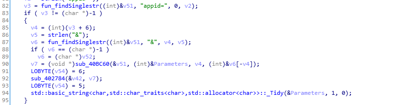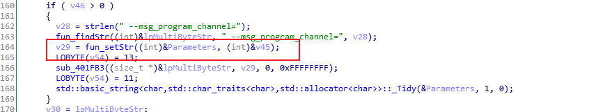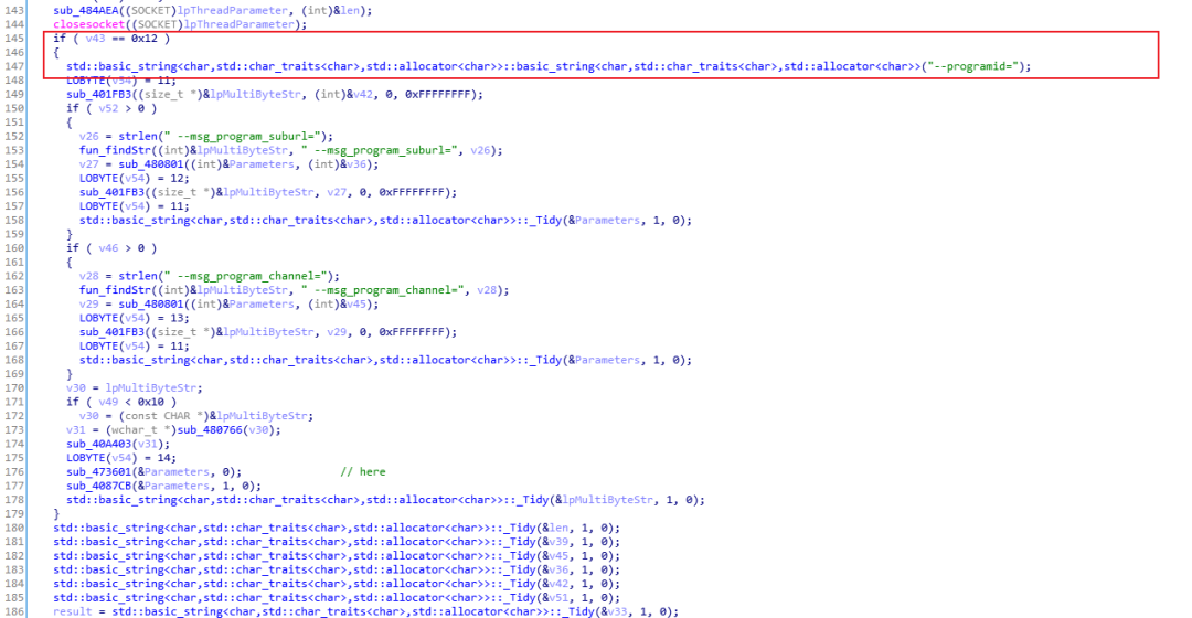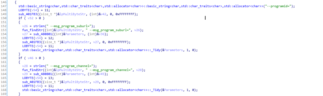 之后进入一个if,该大流程为--programid=分支,漏洞触发函数在here位置,因此可以判定我们的exp中一进入--programid=流程,其值会来自于appid,其中--msg_program_suburl=来自前面的path,--msg_program_channel=来自前面channel,因此这里可以得出以下exp的格式,这里通过写入断点观察可以发现if中判断的0x12的值实际是appid的长度,必须为18。