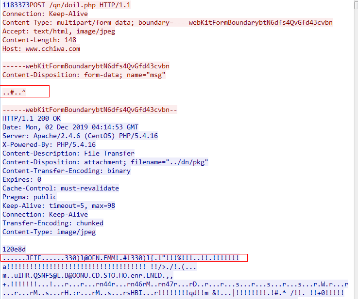 3. 木马会以POST请求发送第三个数据包,该数据包会返回加密后的插件包(webroot/dn/pkg目录),以0x8111212为插件的分割字符,包含5个插件;加密算法为xor 0x21。