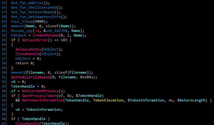 样本起始会动态加载API,并尝试提升到管理员权限。