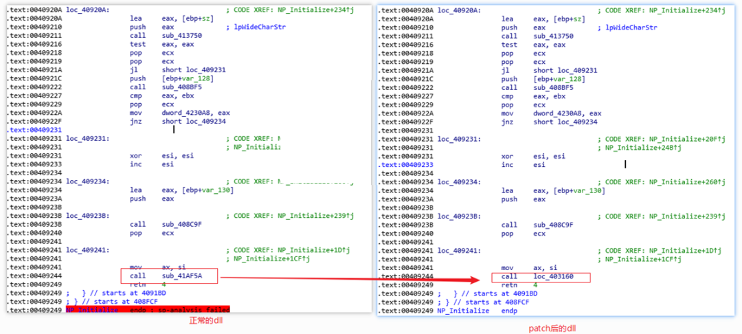 漏洞利用执行完毕后,会先通过Dll side-loading加载np-mswmp.dll,修改了正常的np-mswmp.dll的一个函数,被patch的地方如下: