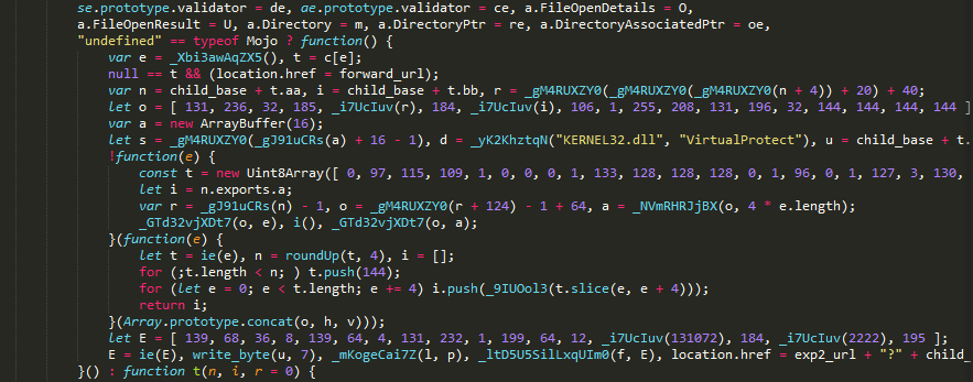 由于部分浏览器chrome内核版本过低,攻击者使用了两个Chrome内核漏洞,分别位于exp1.html和exp2.html,其中exp1.html由project zero 的[email protected]发现,通过该漏洞实现代码执行功能。