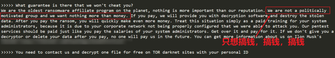 勒索病毒攻击已经成为了全球最大的威胁之一,而且在未来几年里,勒索攻击会越来越多,同时随着APT组织的加入,勒索攻击的手法和技术也会越来越复杂,勒索病毒黑客组织不断在全球寻找新的攻击目标,他们的目标很简单也很单纯,就是为了搞钱,该观点在他们的勒索提示信息文件中已经明确表明了,如下所示: