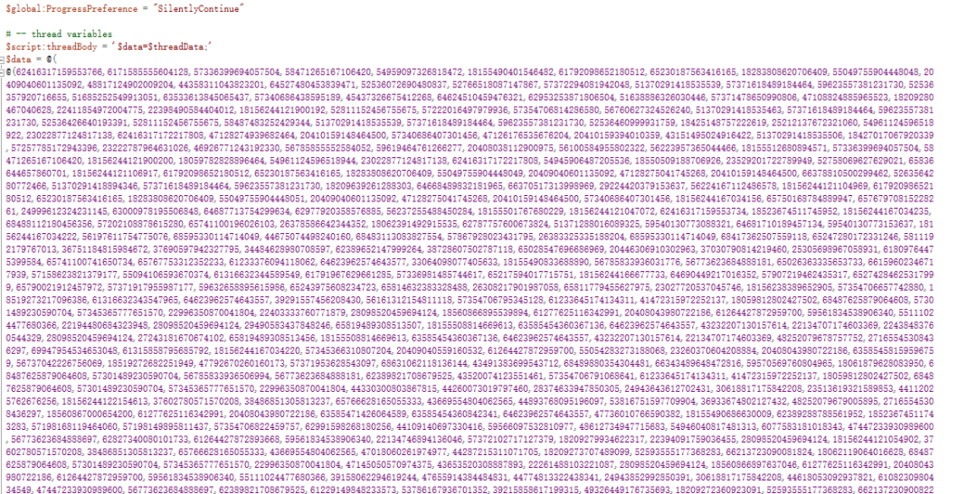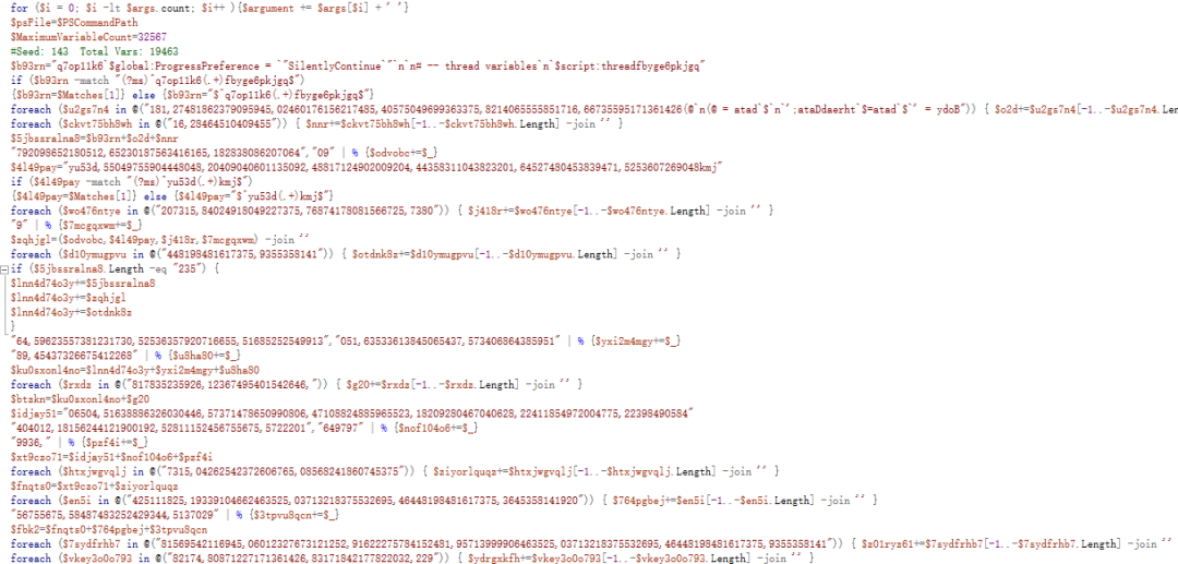 1.该勒索病毒样本使用PowerShell脚本进行加载,原始脚本被高度混淆了,如下所示: