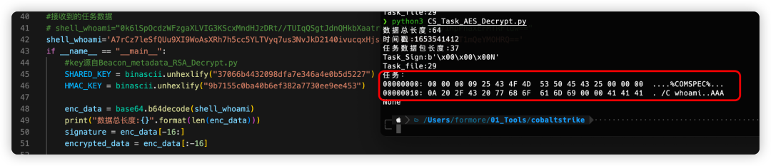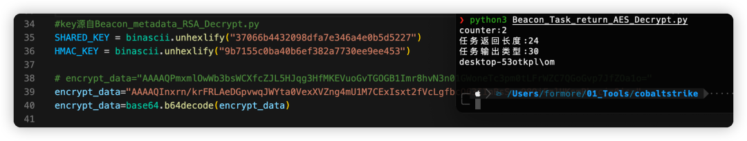从代码中分析就可以知道,元数据本质上是 Beacon 本地产生一个 16 byte的数据,该数据做 SHA-256 处理之后,前16位作为AES秘钥,16-32位作为HmacSHA256,用于加解密传递的数据。