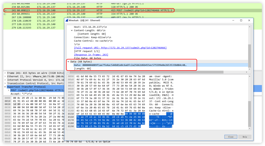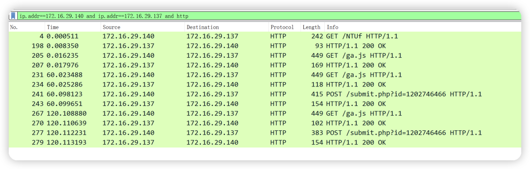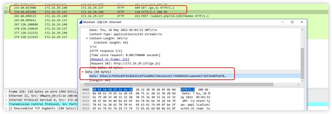 我这里因为执行了sleep 0,所以流量看起来非常不清晰,所以这里我重新抓包分析。