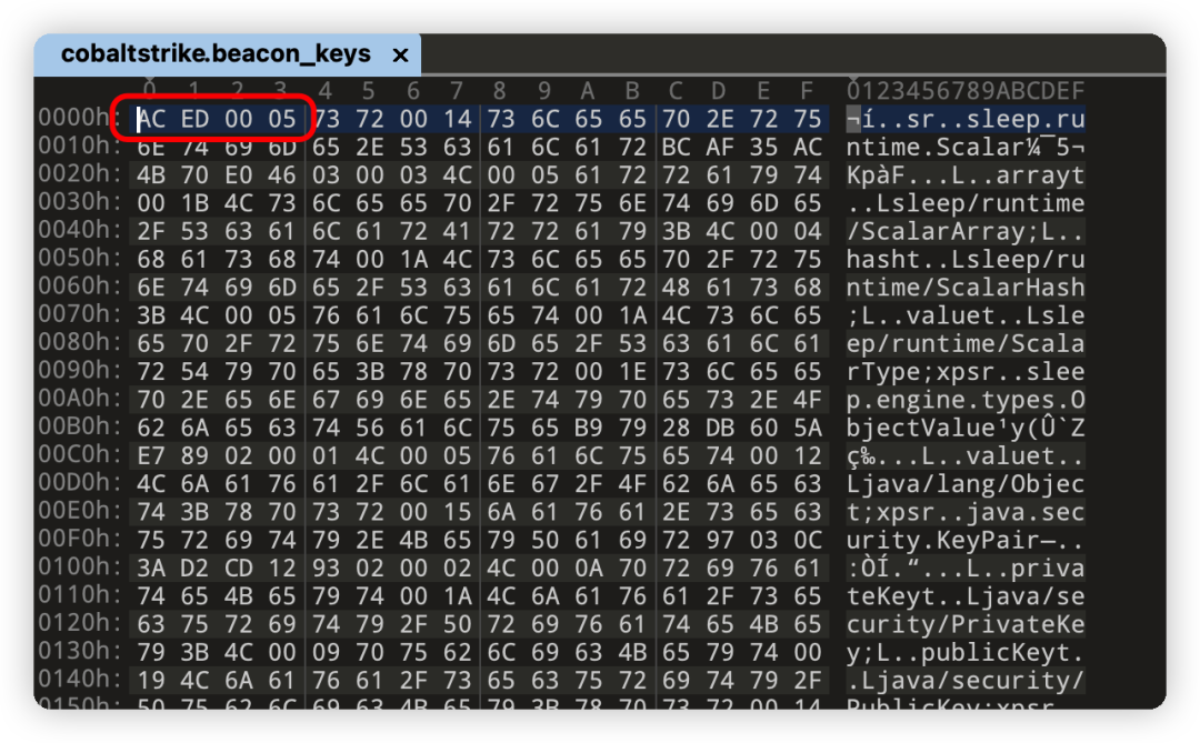 首先找到cobaltstrike.beacon_keys文件,然后打开它,可以发现它是一个序列化之后的文件。