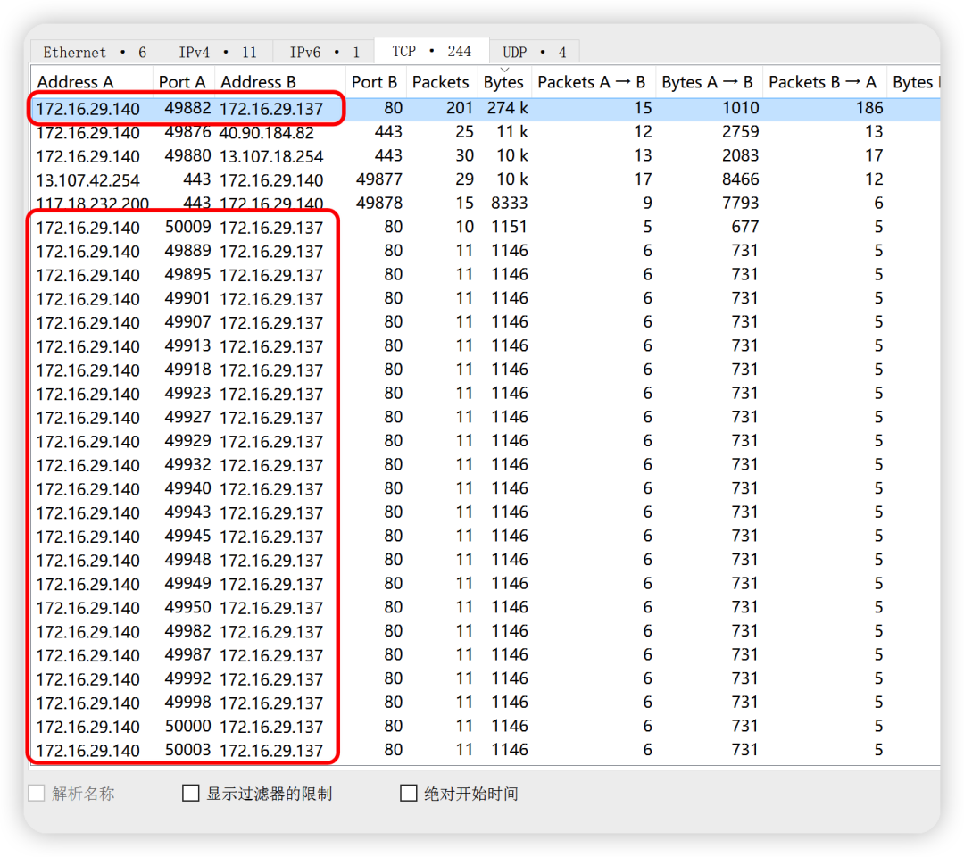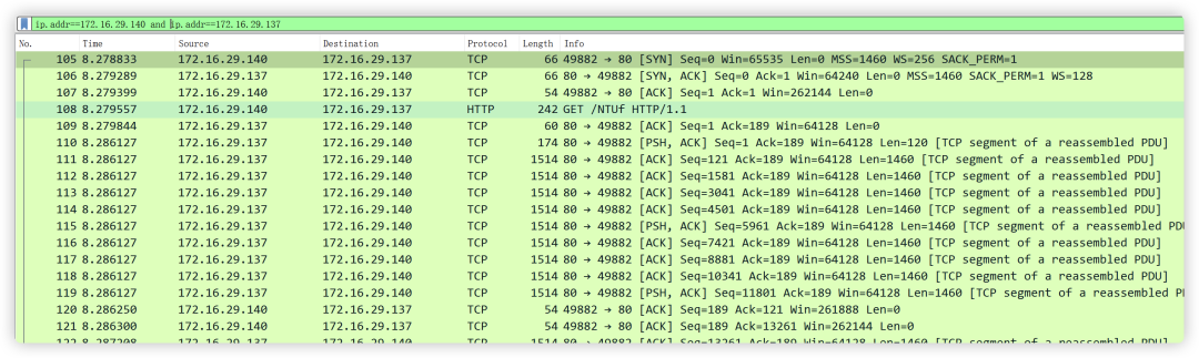 随后过滤相关数据包,直接推荐直接使用ip来过滤,防止漏掉会话流